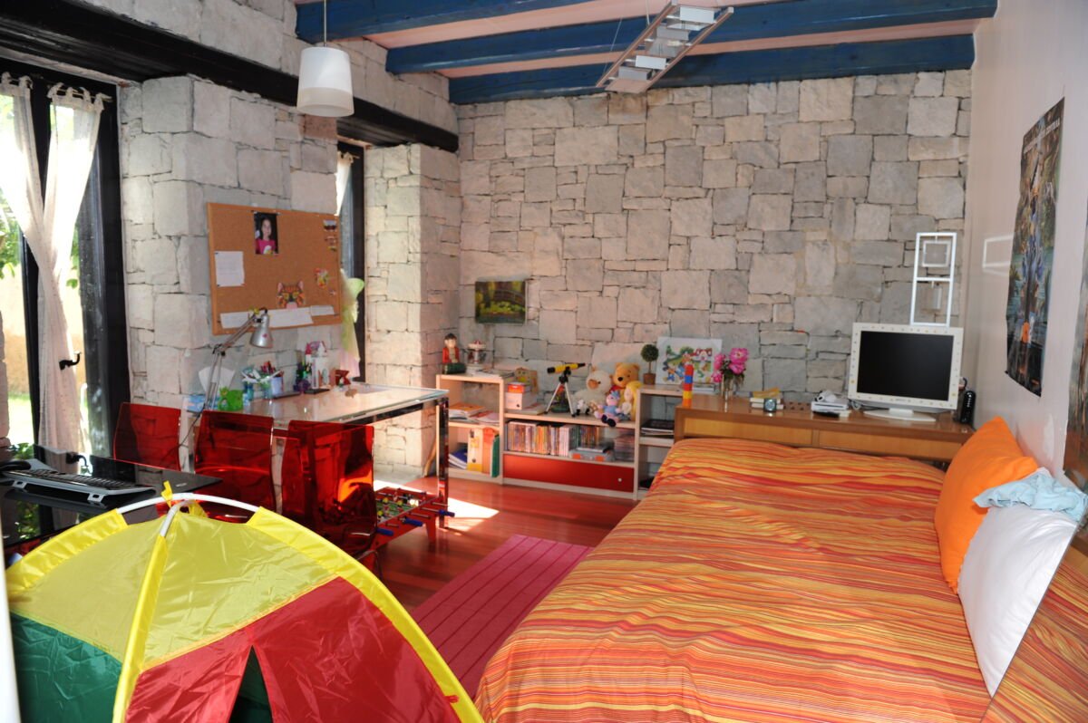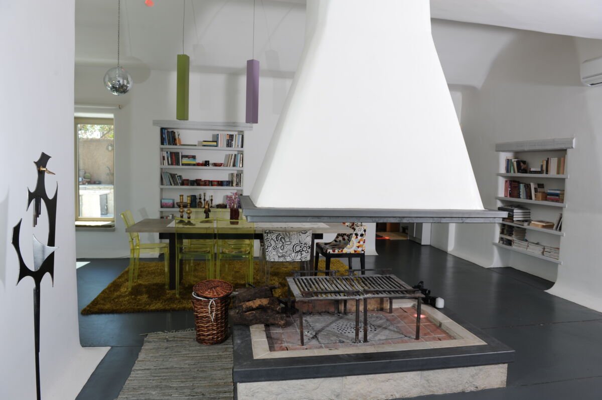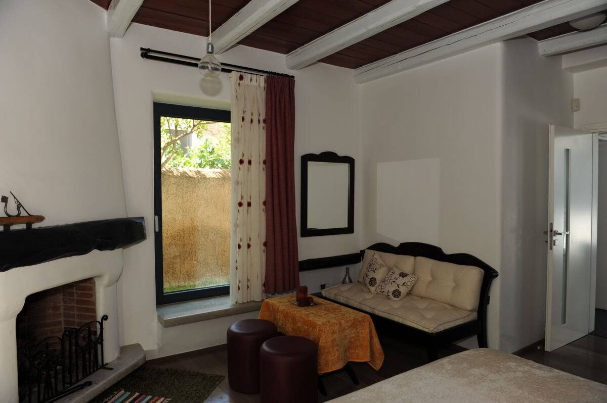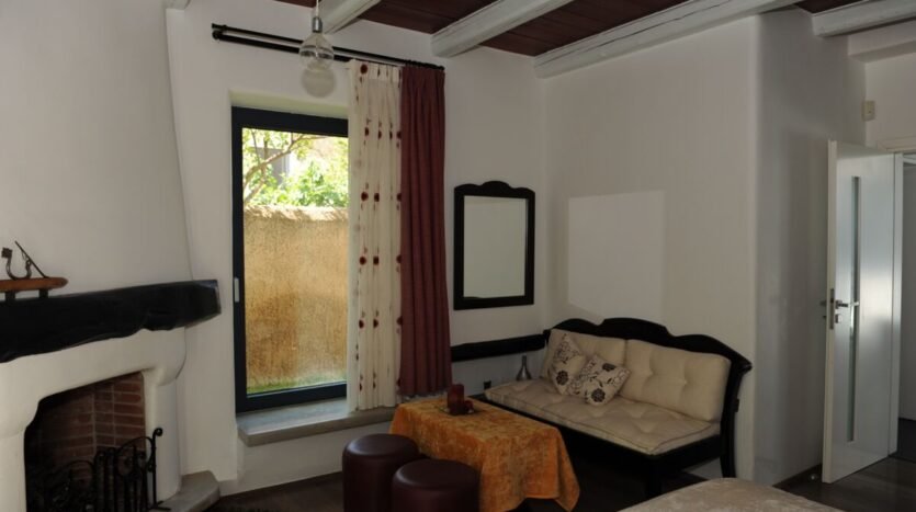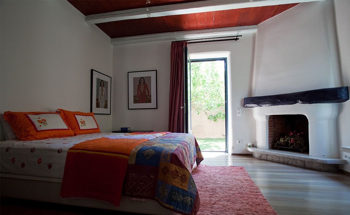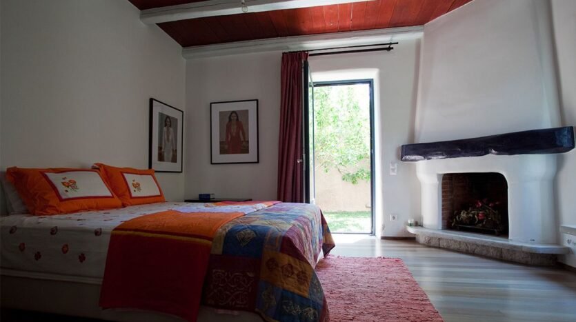 Guest bedroom, with traditional furniture from Crete and a fireplace.